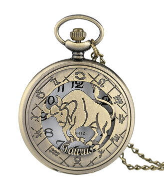 Retro kapesní hodinky se symboly znamení horoskopu. Symboly horoskopu jsou vyobrazeny na otevíracím víčku hodinek. Obal hodinek je vyroben z bižuterního kovu bronzové barvy. Součástí hodinek je řetízek.